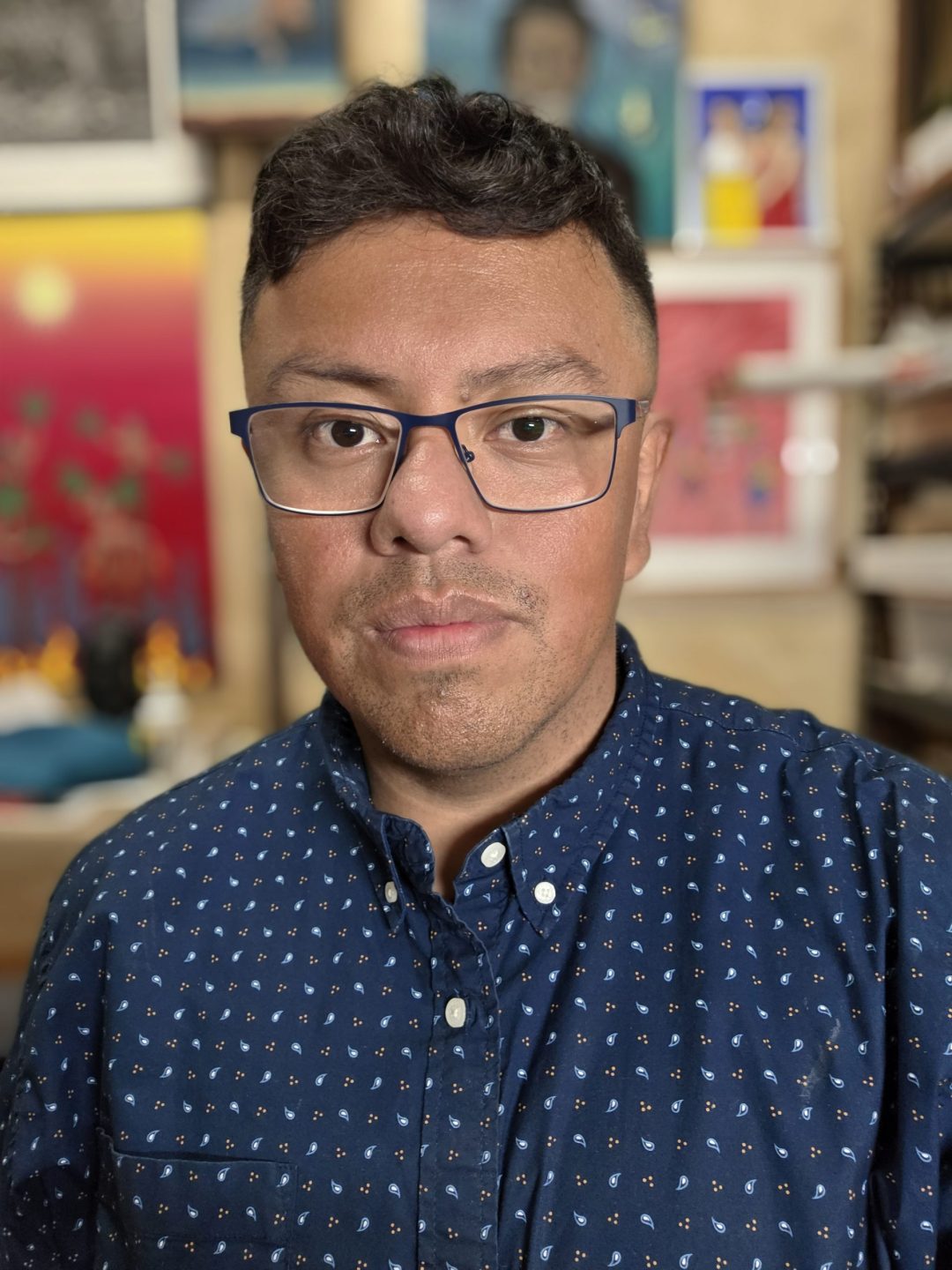 Israel Campos is an interdisciplinary Los Angeles-based Chicano artist who works in painting, print media, and artist books. His work embraces the art tradition of Mesoamerica to explore how historical events are interconnected and reverberate into the present. He operates Chayote Press and is a professor at Loyola Marymount University.